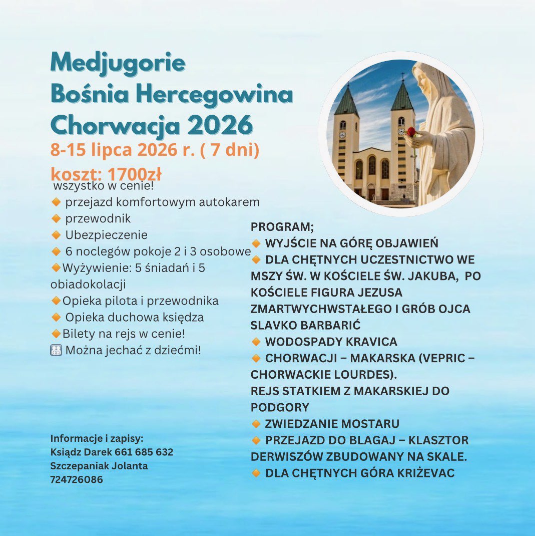 W roku 2026 przypada 45 rocznica objawień w Medjugorie (Bośnia i Hercegowina). Pragniemy zatem zaprosić Was na wspólne przeżywanie tego wydarzenia. Organizowana jest z naszej parafii pielgrzymka do Medjugorie oraz do okolicznych pięknych i malowniczych miejsc. Pragniemy zaprosić na wyjątkową podróż połączoną ze zwiedzaniem świętych miejsc, wypoczynkiem i błogim relaksem nad morzem!